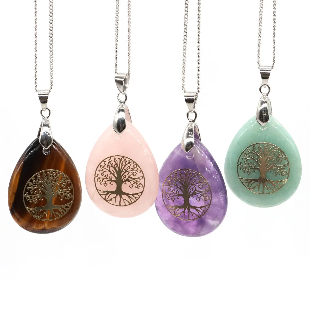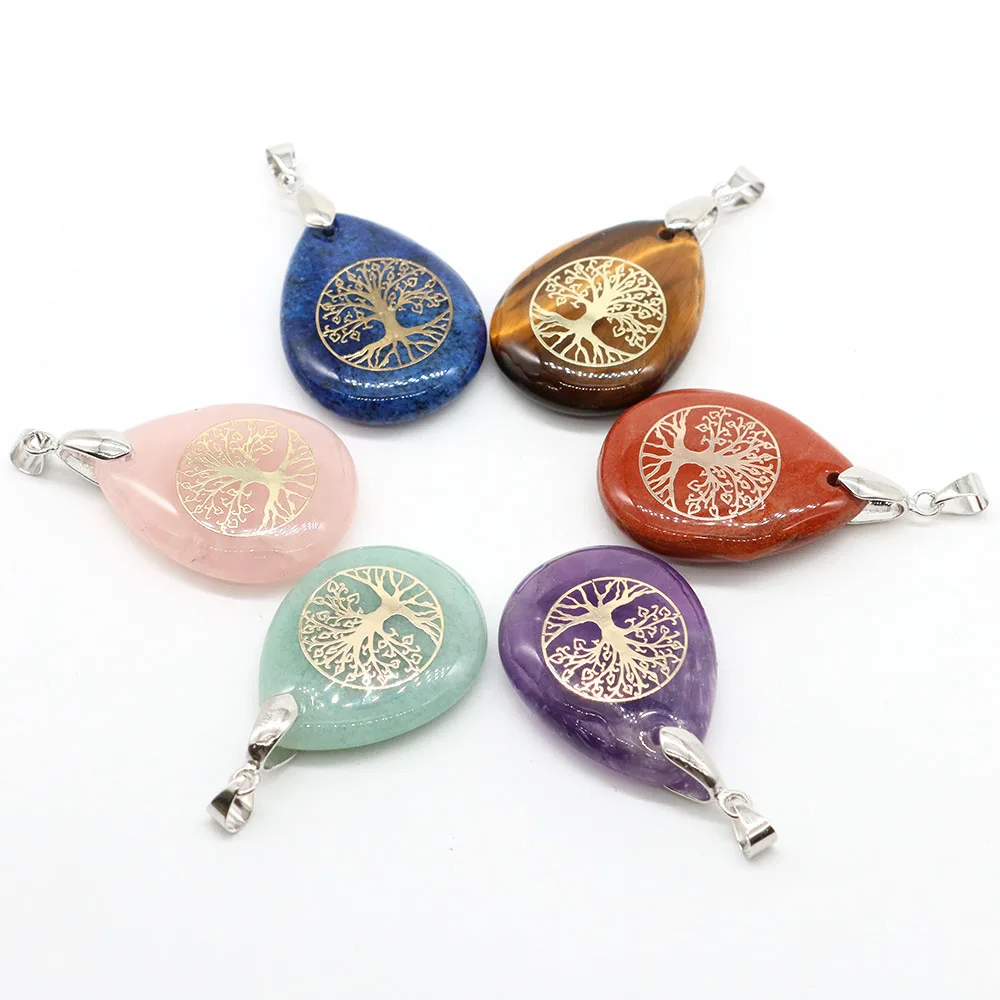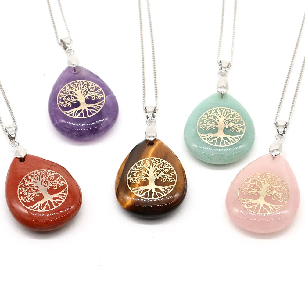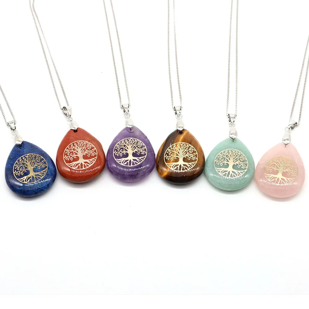 7 Chakra Stone Tree of Life Pendant Natural Water Drop Necklaces Rose Crystal Pink Quartz Amethyst Lapis Lazuli Tiger Eye Gifts